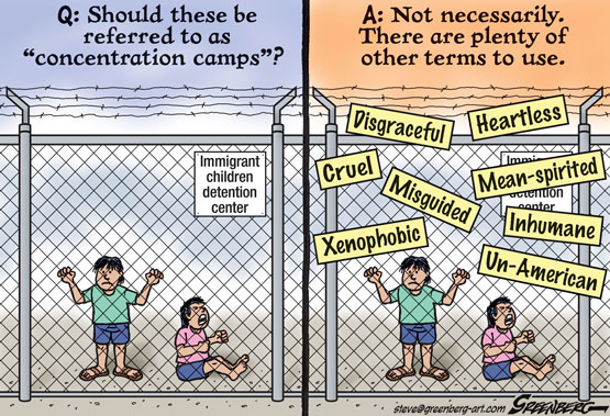 About this cartoon: The Trump Administration's horrifying practice of separating migrant children from their parents and putting those kids in detention facilities comparable to large cages, often without decent bedding or hygiene, led to some comparisons with "concentration camps." The use of that term is highly controversial, but there is little disagreement that throwing kids into such detention facilities is an appalling practice.