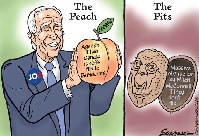 About this cartoon: President-Elect Joe Biden's hopes of getting much of anything of his agenda through the Senate may depend on GOP Senate Majority Leader, Mitch McConnell, who has vowed to block Biden's "entire" agenda, much as he did against Barack Obama. The key to power rests in two Senate runoff elections in Georgia taking place in January. If the GOP wins one or both, McConnell will narrowly have the votes to keep blocking legislation, as he did with the items shown in this cartoon. Should the Democrats win both seats, the Senate will have a 50-50 tie that Vice President Kamala Harris can break in the Democrats' favor.