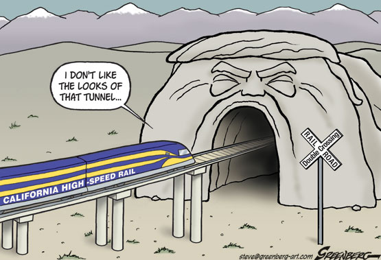 About this cartoon: Donald Trump, always happy to pick a fight with California, demanded the state give back all federal funding for its high-speed rail project after newly inagurated Gov. Gavin Newsom gave a speech indicating that the full bullet train project wasn't feasible at the present time and that only a segment in the Central Valley would be completed for the near future.