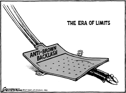 The era of limits Published: Daily News of Los Angeles Date: Nov. 4, 1982 About this cartoon: Jerry Brown's political career was over, in no small part due to his mishandling of the Medfly crisis. His gubanatorial career had begun with his "Era of Limits" declaration (i.e., the old unrestrained days were over), and it seemed fitting for its end. Noteworthy: Nice, simple, clean visual... other than the totally wordless cartoons, this was pretty much the type I aimed for. |