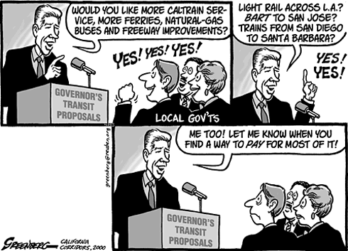 Gov. Davis transit speech Published: California Corridors Date: April 28, 2000 About this cartoon: Gov. Gray Davis outlined ambitious plans for transit projects throughout the state. Only problem was, most of them had state funding for only a portion of the project. Noteworthy: California Corridors' editor had wanted a cartoon that covered politics, transportation and current news at the same time; fortunately the governor's speech fit my timing and needs for this. |