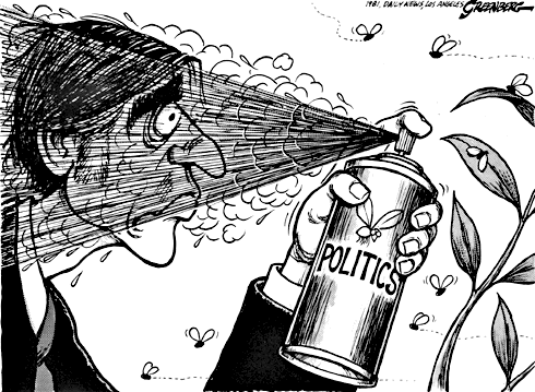 Jerry sprays Published: Daily News of Los Angeles Date: July 19, 1981 About this cartoon: Faced with the growing Medfly crisis, Governor Brown faced opposing interests regarding widespread spraying of Malathion, an insecticde. Urban dwellers were upset at the thought of the spray ruining their cars or maybe poisoning their water, while the important agricultural industry was screaming for the spraying before the infestation could get out of control. Brown hesitated, then finally okayed the spraying... by then the Medfly was in the Central Valley. The crisis pretty much doomed Brown's career in Sacramento. Noteworthy: I think this is one of my best drawings of Jerry Brown, and a good visual overall. |