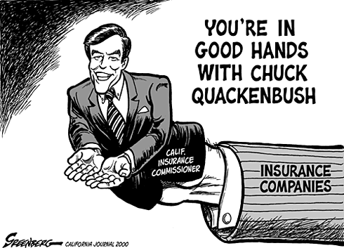 Quackenbush Published: California Journal Date: May 2000 About this cartoon: Charles Quackenbush, the state's first elected (vs. appointed) Insurance Commissioner, was long thought to have been a lackey of the insurance industry. His career was collapsing as this cartoon was being published, as he was found to have coerced insurers to pay into a slush fund-- supposedly for victims of the Northridge Quake-- used to benefit Quackenbush himself (as well as his family); he soon resigned in disgrace. Noteworthy: Drawn without a place to be published (offered to my then-employer, the San Francisco Chronicle, which refused to run my cartoons). California Journal fortunately decided to use it, before soon deciding to discontinue the use of cartoons in the magazine. |