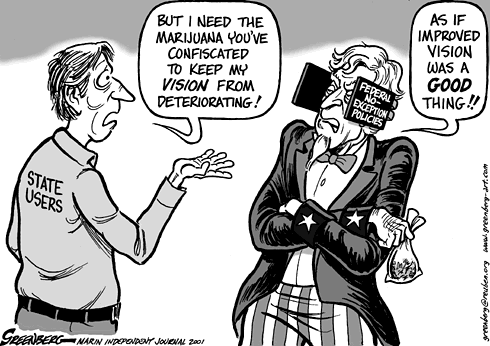 State users vs. Uncle Sam Published: Marin Independent Journal Date: Aug. 2001 About this cartoon: Even though local officials were willing to overlook growing operations of marijuana intended for medical use in the spirit of an initiative passed by the state's voters, federal officials have been unyielding in maintaining a "zero tolerance" the status quo. Noteworthy: One of an ongoing series of cartoons on the topic. The blinders on Uncle Sam read "Federal no-exception policies." |