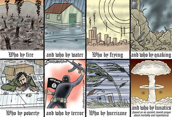 About this cartoon: Largely a cartoon for Yom Kippur, or the Jewish Day of Atonement, this cartoon reworks an ancient prayer citing the many, many ways one could die, with an underlying message that prayer, good deeds and repentance might help a person to avoid such a fate, as well as a message to make the most of whatever time one has remaining. With a series of natural and human disasters, and Donald Trump threatening to goad North Korea into a nuclear war, the message of this ancient prayer has renewed relevance.
