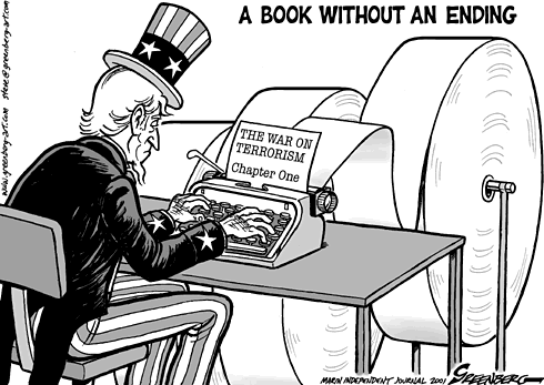 Chapter One Published: Marin Independent Journal Date: Oct. 11, 2001 About this cartoon: President Bush and Congress declared a war on terrorism asking (and generally getting) national support, and began bombing Afghanistan for its harboring of terrorists. But this was is against an unseen, spread-out enemy willing to use any means, including suicide, to achieve its goals. This is less of a war than it is a new way of life, one possibly with no end. Noteworthy: This is a sort of classic style for me, in its use of visual symbolism, lack of words, and a tighter drawing style, hearkening back somewhat to my Daily News of L.A. days. |