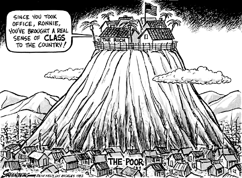 A sense of class Published: Daily News of Los Angeles Date: Jan. 21, 1982 About this cartoon: President Reagan was lauded for bringing a sense of "class" back to the White House, meaning as much as anything being into the formalities of the office, in contrast to his predecessor Jimmy Carter's informality. But under Reagan, the rich got richer and the poor got poorer as national divisions deepened. Noteworthy: The type of cartoon that probably did not endear me to the editors of the Daily News, a place of Reagan stalwarts. |