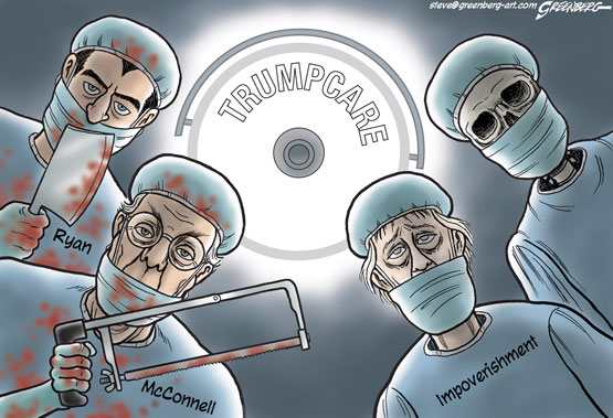 About this cartoon: Following the lead of the House Republicans, the GOP-led Senate crafted, in great secrecy, their plan to "repeal and replace" Obamacare. Like the folmer, it is a mean-spirited piece of legislation that would throw millions off of health coverage, provide worse care at more cost, cap maximum coverages (hurting the sickest) and (most importantly to the GOP) provide a tax windfall for the very wealthiest. Those with high-cost illnesses, such as cancer, would be mostly left to fend for themselves with denied or unaffordable health coverage, while average citizens would get skimpier coverage.